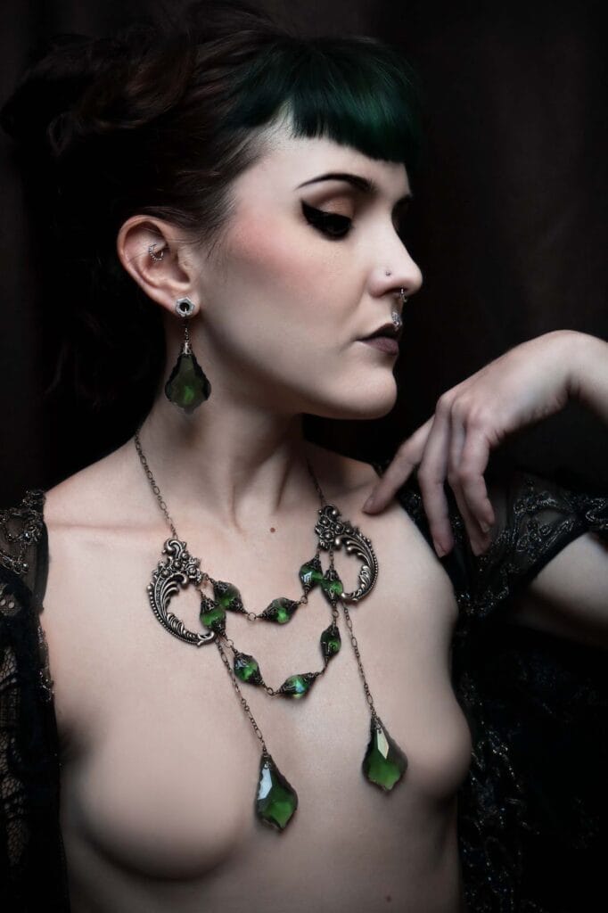 How do you incorporate symbology/symbols in your art & jewelry?Some imagery I use can be easily identified from media like fairytales and mythology. For example, snakes evoke Lilith vibes while incorporating a rosary of garnets evokes Persephone. I love to use mirrors in my art and jewelry work since it brings the viewer into the art they are gazing at. The designs I create are intentional with a certain number of beads, chain links, rows, etc. utilizing numerology and numbers of the Major Arcana in Tarot. Color and shape also hold a specific meaning and purpose; reds for fire or spirit and blues for water and emotion. If you look, and know how to look, symbolism and the story I want to tell can be found there.
