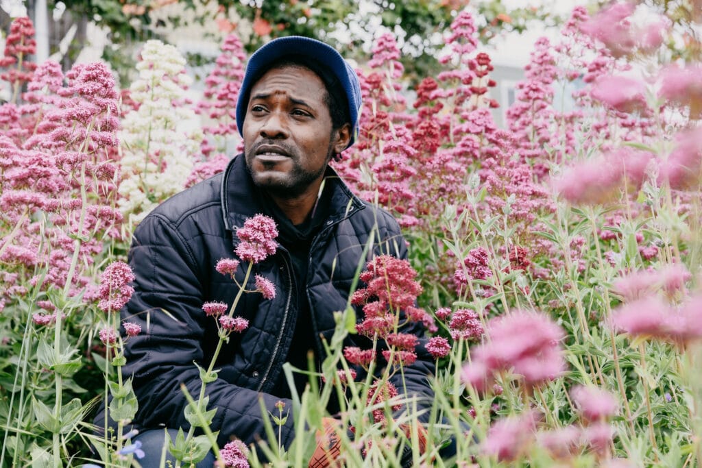 Isaiah Powell sits in a patch of blooms that he grew in the Bayview neighborhood – photo by Vita Hewitt
