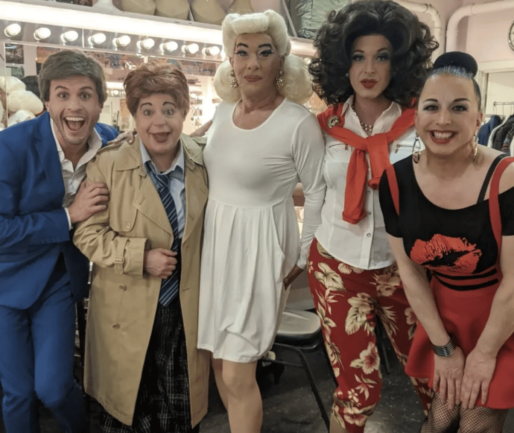 Michael Phillis backstage for the show he wrote called “The Hand That Rocks the Crawford” at Oasis. The cast from left to right is Sara Toby Moore, Matthew Martin, Katya Smirnoff, and Steven LeMay.