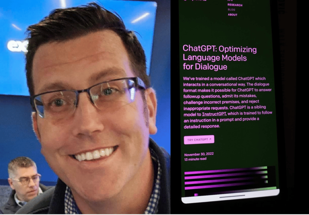 Photo of Christopher Block from his FB page. Photo of ChatGPT by Rolf van Root on Unsplash