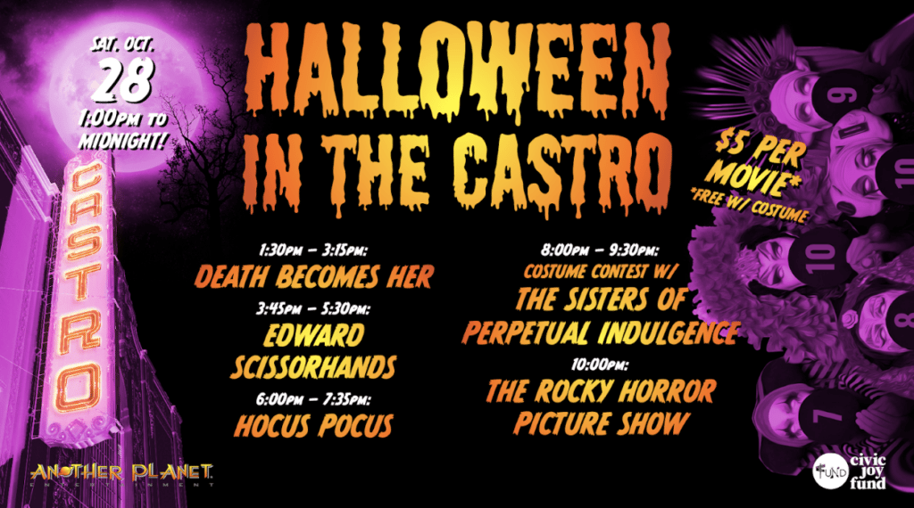 The Castro Theatre, an iconic landmark, will play a central role in this year’s celebration. On October 28, it will host $5, mostly kid-friendly movies, starting at 1:30pm, a thrilling lineup of activations all around, and an outrageous costume contest organized by the Sisters of Perpetual Indulgence. The contest kicks off at 8 p.m., followed by a screening of the cult classic The Rocky Horror Picture Show at 10 p.m. Attendees in fabulous costumes might even score a free ticket, thanks to Sister Roma and her golden ticket giveaway.