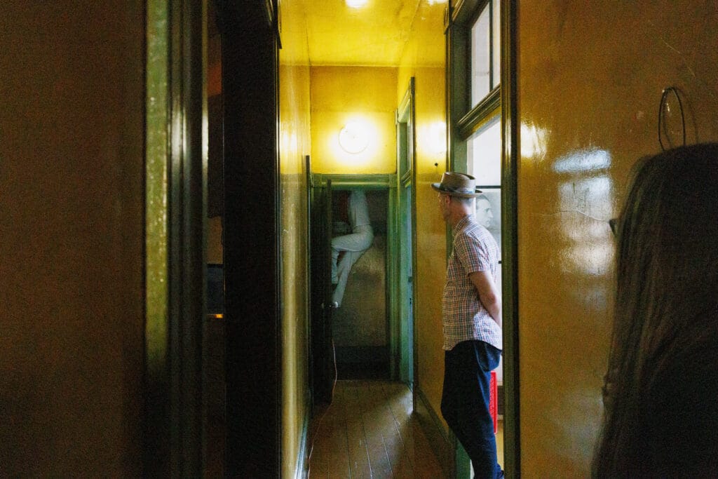 This varies wildly. It can start with a nagging obsession with a material (Elmer’s glue, stage blood, power cords), an image or task that pops into my mind (a deleted figure disappearing into a deleted space, a figure being dragged), the architecture of the site bringing an idea for an action (a glassed-in storefront window, a multilevel ramp). Then I problem solve, shaping the initial impetus into a full, formally rigorous piece while heavily considering how the audience views it. This has sometimes involved the viewer only seeing the piece as a live video feed, looking through a peephole, or bringing audience members into the piece one at a time.