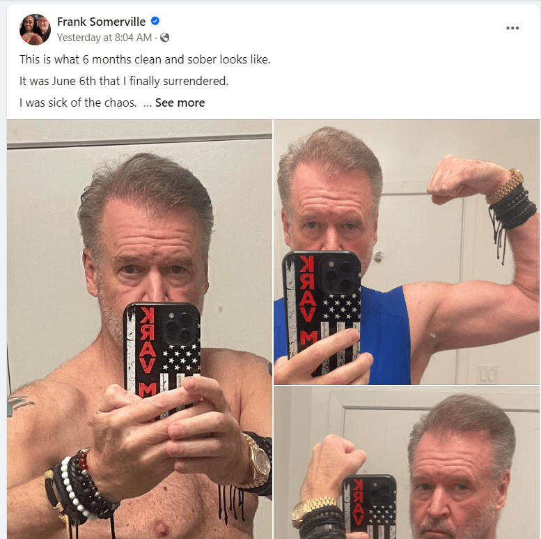 But today, Frank is flexing on Facebook, saying that he’s “6 months clean and sober.” You can read his post below, and admire his guns. As he says in his post, “Pretty cool that I can rock a compression muscle shirt at 65 years old and not embarrass my two daughters.”
