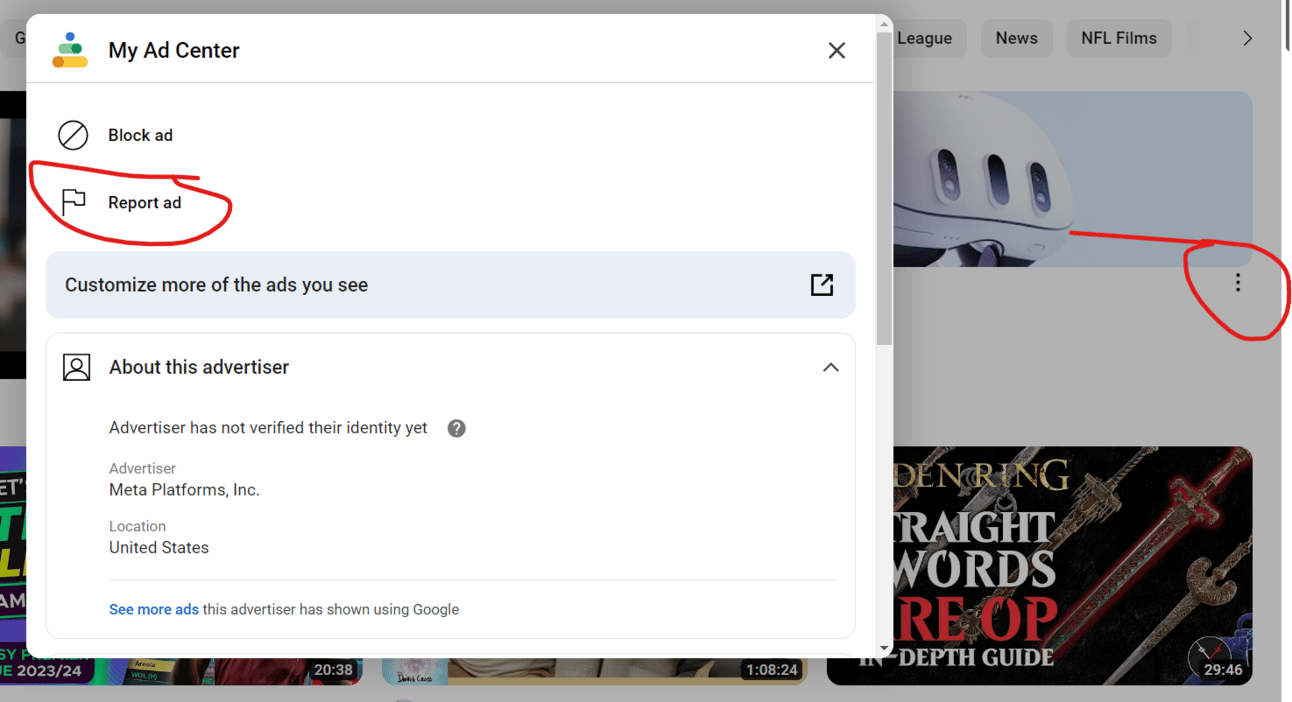 Click on the ad prompt (not on the ad itself) in YouTube’s case it’s the 3 dots on the side of the ad.