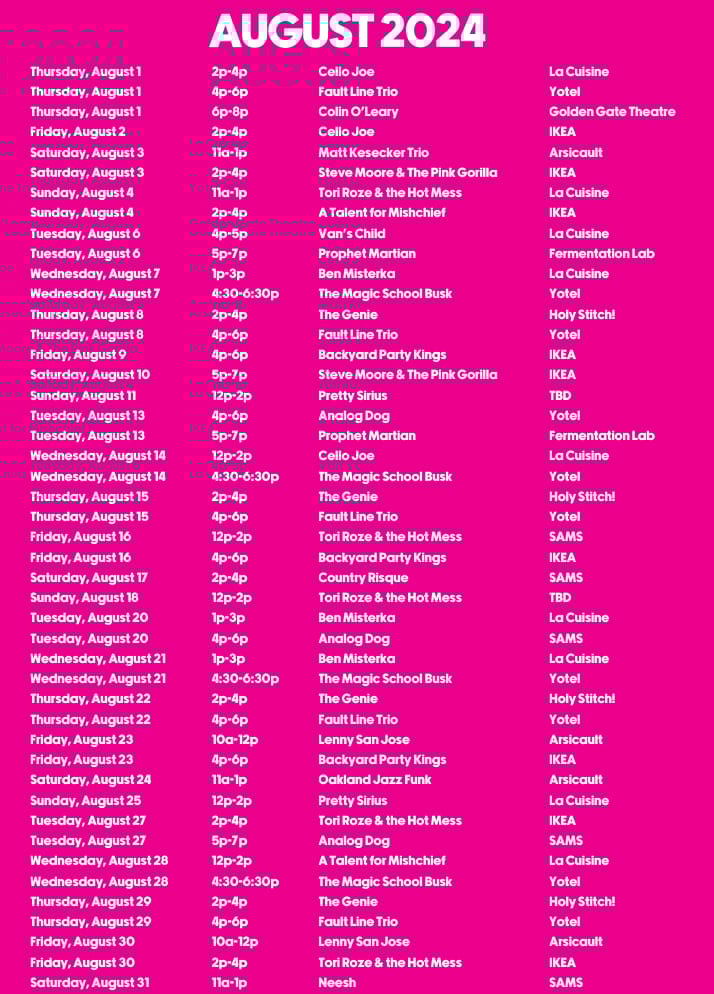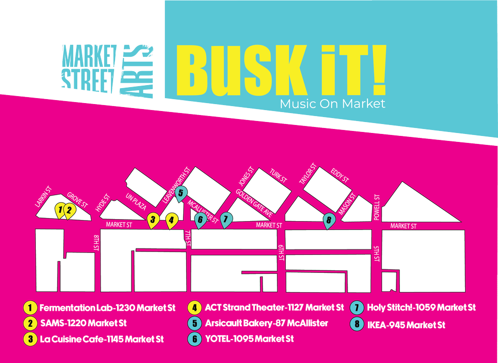 Enjoy the ongoing music experience on Market Street by visiting the performance locations on the map and monthly schedule below:
