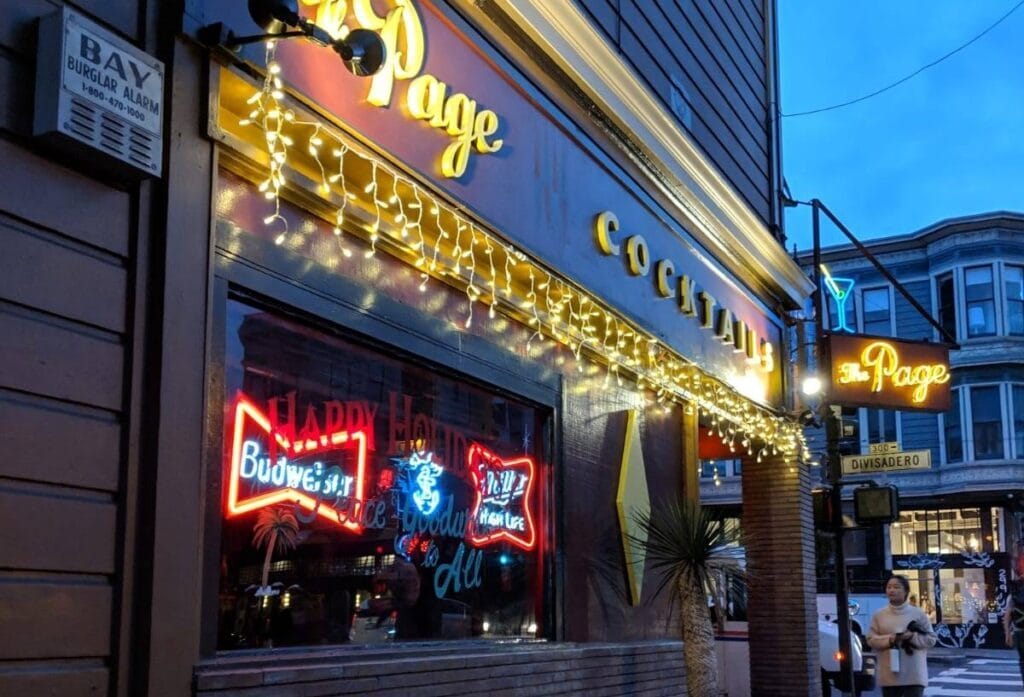 The Page sits on the quiet corner of Page Slow Street. The outside tables flock against the building under living room decor, including oil paintings and antlers. A statue of St. Francis of Assisi watches over the parklet. Inside, cash-only drinks at dive bar prices keep customers happy. Part of the charm is that everything from the carpet and somewhat strange smells reminds us of having a drink in a distant relative’s den. It’s homey, quirky, and crowded by locals – perfect for a second date or a married couple’s night out.