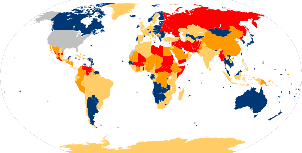 The U.S. Department of State Travel Advisory levels are Grey for the United States/Not Mentioned, Blue for “Exercise normal precautions,” Yellow for “Exercise increased caution,” Orange for “Reconsider travel,” and Red: “Do not travel.” Creative commons.