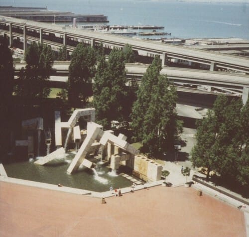 This photo shows the freeway from the Hyatt Regency in 1988, as well as the Vaillancourt Fountains: