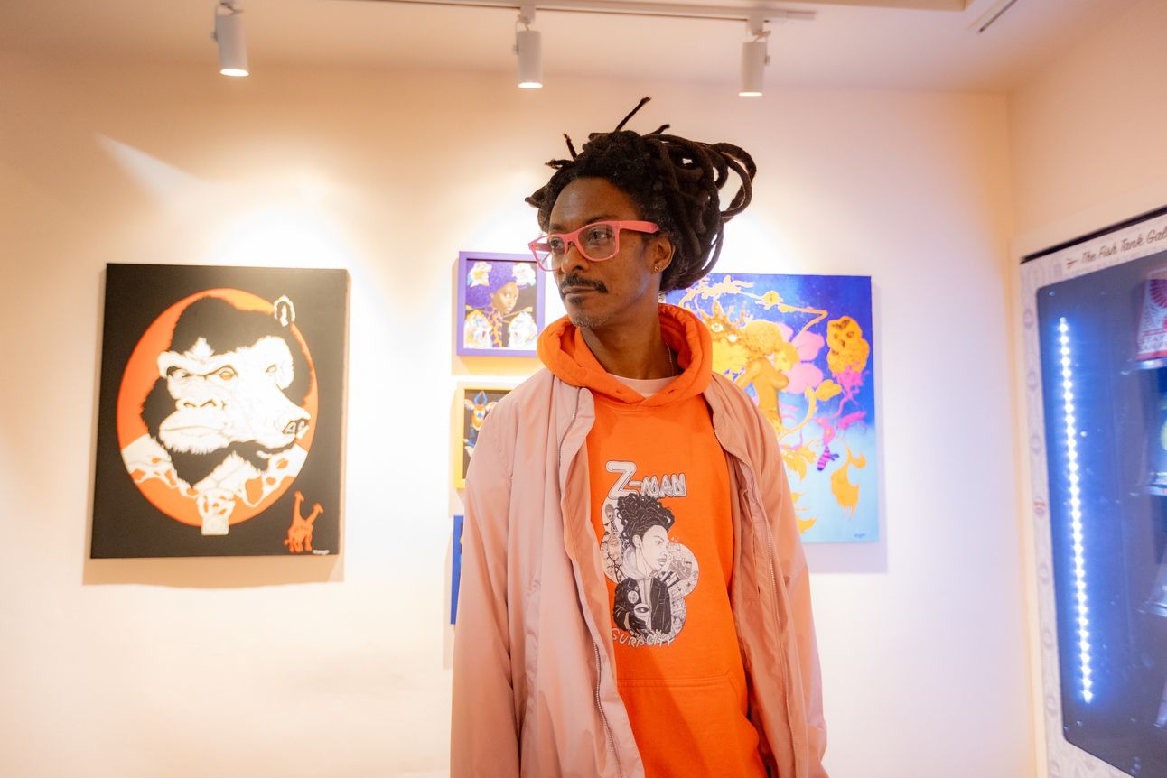 Z was showing a collection of works at none other than Jeremey Fish’s Fish Tank Gallery. “Sorry Not Sorry, Yet” brought out a handful of Gurp City Allstars, musicians, and neighborhood riff raff like yours truly. Zamon paints with a vibrant consciousness that can only be matched by his music. It’s like a mushroom trip gone right. Show stealers like “Mind Over Booty” which depicted a big bootied naked woman being watched by various eyes and owls but instead of a glamorous face it was a brain. This could have many takeaways depending on the viewer.