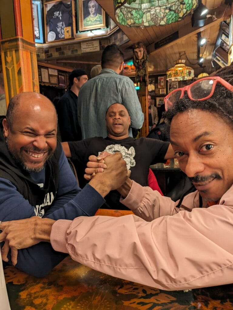 What probably should have been an Uber ride home and a call for the night ended up being a trip over to Vesuvio. Thanks to Z being Z we were ushered past the line where I was quickly able to rearrange some lovely patrons in order to slide some tables together. Then the chaos ensued. If you ever wanted to see grown men pushing 50 arm wrestling and doing their best to get kicked out, look no further than us. Z-Man is just an entertainer at heart. If you’ve been to one of his shows you know the vibe, arms swaying, running on stage side to side, while the world’s longest dreads hover a few inches from the floor. So it was a surprise to absolutely nobody when Z jumped up on the bench, threw a foot on the table and began dancing his way up which was immediately shot down by the bartenders 3 feet away. My man!
