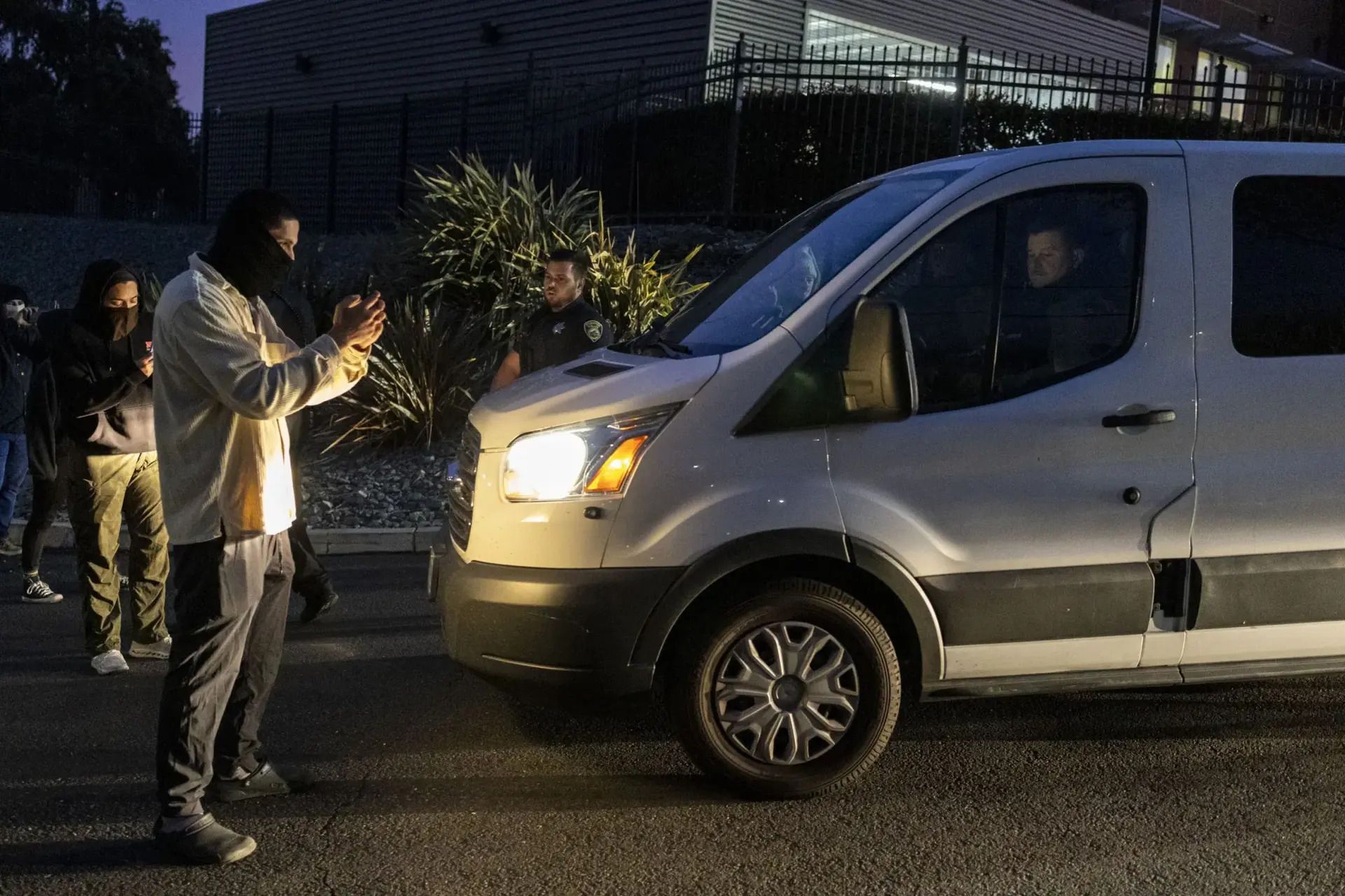 Stockton Police ask activists to not block a driveway as vans and other vehicles leave a U.S. Immigration and Customs Enforcement office at 603 San Juan Ave. in Stockton, California on Saturday, Oct. 25, 2025. (Photo by Annie Barker/Stocktonia/CatchLight Local/ Report for America)