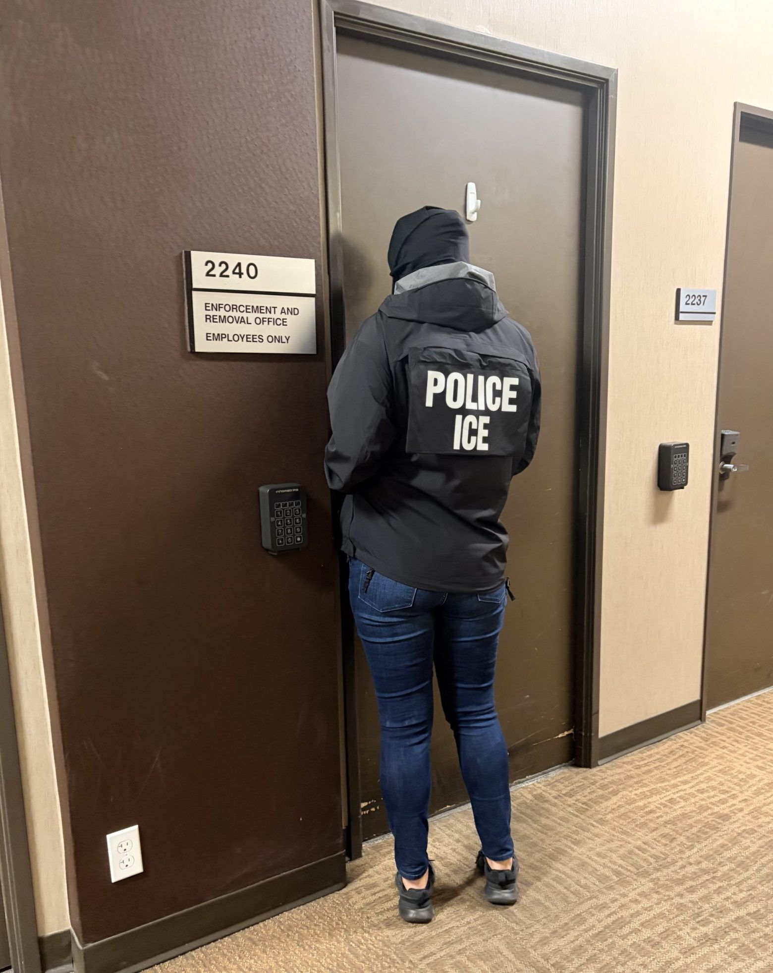 Immigration agents make arrests of people checking in with the agency at its San Diego offices, Oct. 21, 2025. (Photo by Adrian Childress/Times of San Diego)