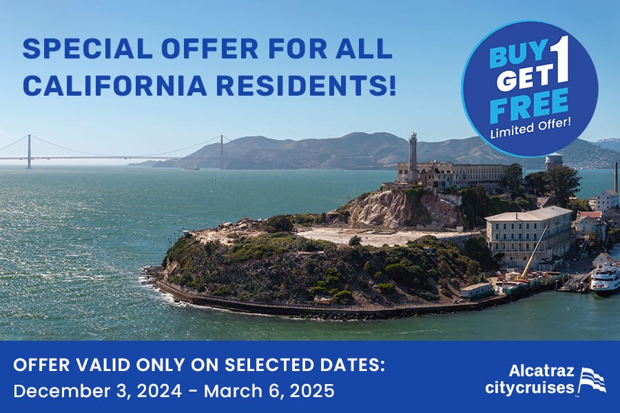 Alcatraz City Cruises is offering a “Buy One, Get One Free” (BOGO) ticket promotion to all California residents for the Alcatraz Day Tours! This special “Buy One, Get One Free” ticket promotion is available only to California residents on select 2024 – 2025 dates.