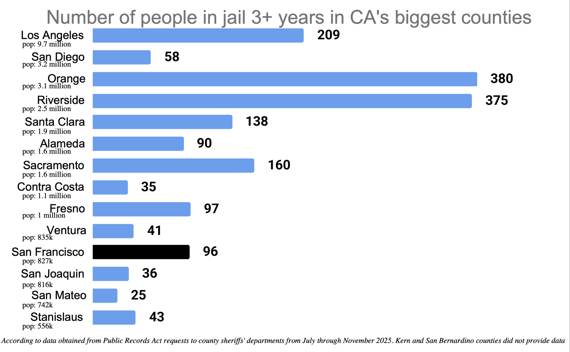 Hundreds of people have been waiting for years in county jails across the whole state of California. It's a problem that was last highlighted in the aftermath of the Covid-19 outbreak and has only gotten worse. Compared to some other counties, San Francisco appears to have a disproportionately high number of people waiting for years in jail. Alameda County jails, for example, have approximately 90 people waiting at least three years, and Alameda County is twice the population size of San Francisco.
