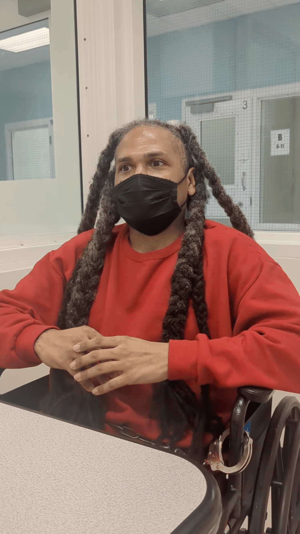 It was an ordinary day in June 2025 when Bell and Brackens were brought into Judge Caffese’s department for another hearing. Bell had long grey dreadlocks and was shackled around the waist to his jail-issued wheelchair. He was dressed in red to signify that he was in administrative segregation. Brackens was in standard orange. They reached for each other’s hands and embraced with a hand shake in the brief moment they got to interact in the courtroom.