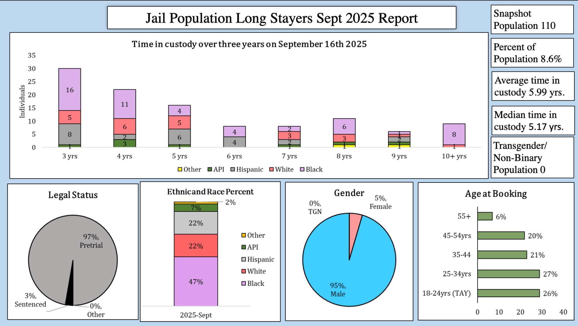 People in jail at least three years are labeled “long stayers” by the San Francisco Sheriff’s Department. They make up 8.6 percent of the jail population, according to a monthly jail population report. A total of 280 people have been in pretrial detention in San Francisco for at least one year.