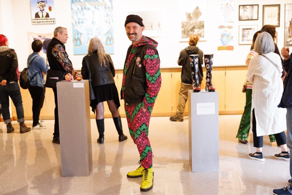 Jason Wyman, an artist in the show came over to speak with me. Their piece It’s Queer Pride 2019 stared boldly out from amongst the works. However, it was their oufit that drew my attention. Delightfully, it turned out to be their fashion line Queerly Complex Queer Comfortwear. Jason told me “We Queerdos deserve to feel comfortable and confident in our skin no matter our gender, sexuality, body size, disability, place of birth, family, race, or class. Queer Comfortwear is here to help us feel just that. With colorful designs that hold radical political messages, it is our armor as we go out into a world hostile towards Queerdos.”