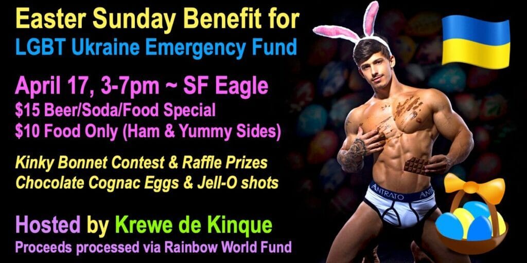 Join the members of Krewe de Kinque charitable Mardi Gras club as we host a spectacular Easter Sunday celebration at the SF Eagle benefiting the LGBT Ukraine Emergency Fund!