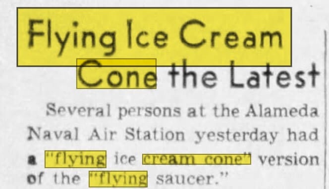 News of this sighting began to spread like wildfire, and it wasn’t before long that a headline involving an ice cream cone could be found on many of the prominent newspapers in the bay area, and beyond. I skewered through many of these, most of which were identical articles, with one statement that stood out to me the most: “Intelligence officers of the western air defense zone are checking on reports of a “flying ice cream cone.” They didn’t seem excited about it.”