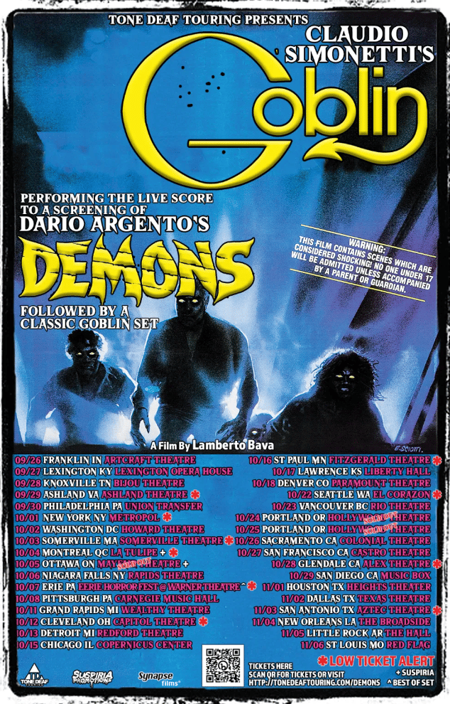 Composer Claudio Simonetti has written and recorded some of the most influential scores and soundtracks in horror, including Suspiria, Dawn of the Dead, Deep Red / Profondo Rosso,Tenebre, and many others, with his seminal work still informing the genre to this day. This year, Simonetti’s Goblin celebrates Dario Argento’s 1985 classic, Demons, with a live performance of the score set to a screening of the movie. Following the finale of the film, the collective will return after a brief intermission to deliver an additional performance of quintessential Goblin material and “best of” songs and scores set to their cinematic counterparts.”