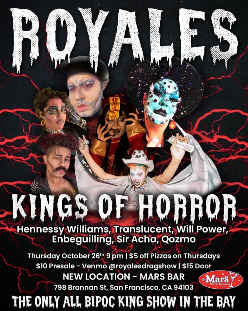 Thursday, 10/26ROYALES – Kings of Horror Halloween Drag Show & Party10/26 | Mars Bar & Restaurant | 798 Brannan St, SF | 9 pm | $10-15ROYALES, the ALL-BIPOC DRAG KING SHOW in the Bay is back! Here comes our well-awaited Halloween show with a super star cast!