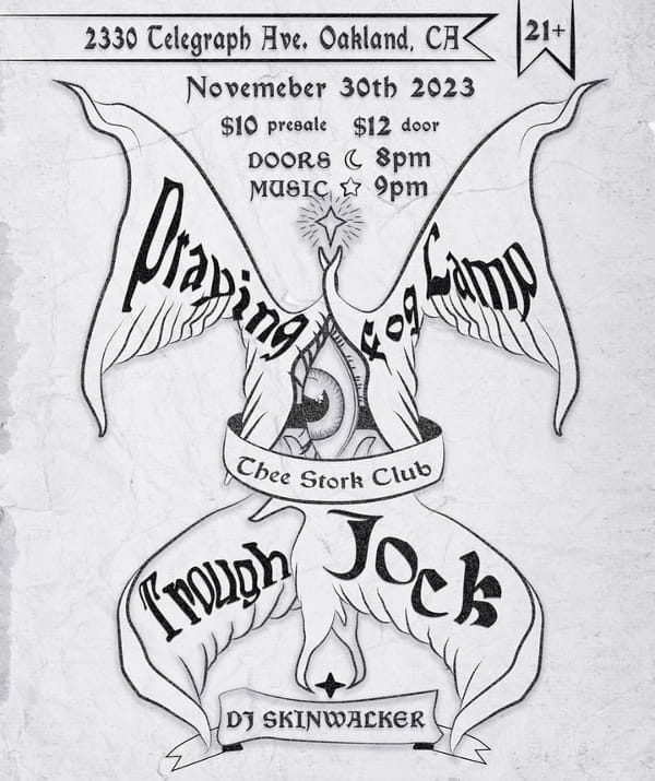 11/30 | Thee Stork Club | 2330 Telegraph Ave, Oakland | 8 p.m. Doors | $10/advance $12/at the door