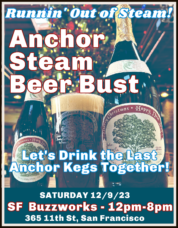 The ‘Running Out of Steam’ Anchor Beer Bust!12/9 | SF Buzzworks | 365 11th St, SF | 12 p.m. | FreeCalling all Anchor Lovers! The last known Anchor Steam Beer, CA Lager, IPA, Hazy, & San Pancho kegs in the world are being cracked, drunk, and celebrated at Buzzworks in San Francisco! There’s an Anchor Christmas Ale Magnum raffle to raise money for the workers of Anchor Steam (Anchor SF Cooperative) to buy back the Brewery and keep it in SF too!