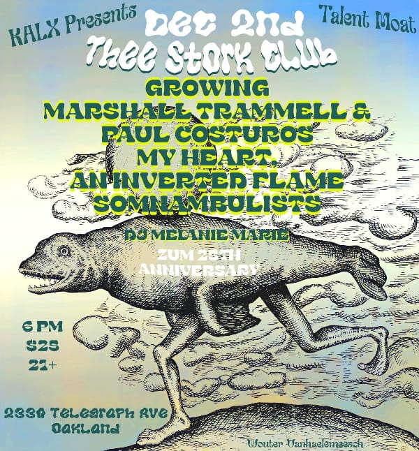 ZUM celebrates its 25th anniversary as a record label with a series of shows on the West Coast. On Saturday, Dec 2, Oakland California’s renovated Thee Stork Club will host the Bay Area return of GROWING after thirteen years away! They will be joined by synth-doom act My Heart, an Inverted Flame, New York’s Somnambulists (solo project of Warren Ng), and Marshall Trammell & Paul Costuros Duo). and DJ Melanie Marie.