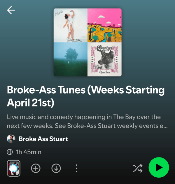 Listen to this week’s playlist so you can sample upcoming bands and comedians listed in this newsletter.