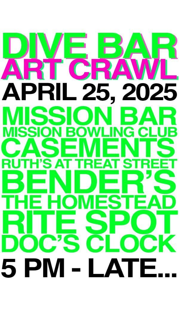 It all started with a solo art show at Mission Bar and a big idea: What if the Mission’s dive bars became art galleries—for one unforgettable night? Back by popular demand, the annual The Dive Bar Art Crawl returns this Friday, April 25th! With 8 bars and 30+ local artists, this is your chance to see SF’s art and dive bars collide.
