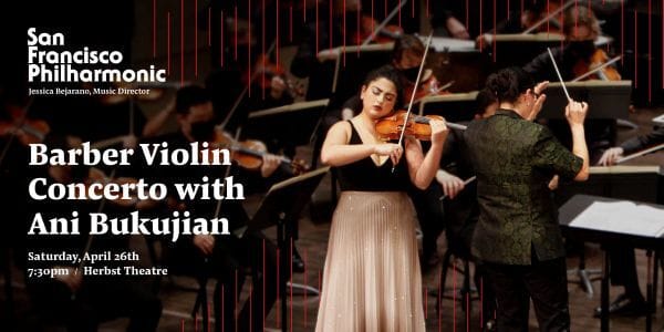 SF Philharmonic Presents: Barber Violin Concerto with Ani Bukujian4/26 | Herbst Theatre | 401 Van Ness Ave, SF | 7:30 p.m. | $30-$40The San Francisco Philharmonic is delighted to be joined by Ani Bukujian, principal second violin with the San Francisco Ballet Orchestra, who will perform Barber’s soaring Violin Concerto–it’s sure to wow listeners. Get your tickets here.