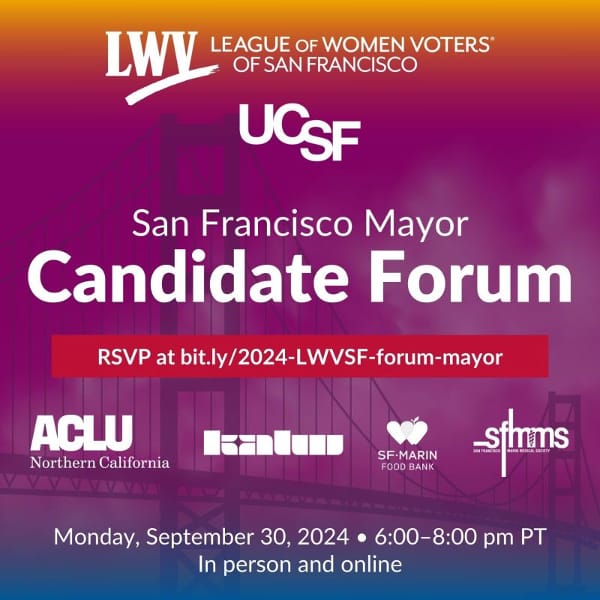 Monday, 9/30San Francisco Mayor Candidate Forum9/30 | Mission Bay Conference Center – UCSF | 1675 Owens St UNIT 251, SF | 6 p.m. | Free w/ RSVPAttention voters! Hear from the candidates for San Francisco Mayor to help you decide who to vote for in the November election. Attend in person or watch online. You’ll hear candidates answer questions about policy and share their views on issues important to your community. Forums are nonpartisan, free, and open to the public.