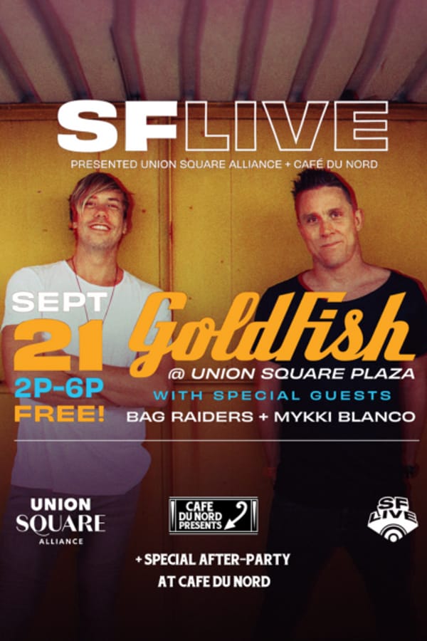 Created as a love letter to San Francisco, this special SF Live concert will be featuring GoldFish, Bag Raiders, and Mykki Blanco who are ready to close up summer in style with energetic music, outdoor vibes, and good times that await. Following the FREE Concert in Union Square, GoldFish is having an After-Party at Cafe du Nord and we want to send you to attend! Enter here.