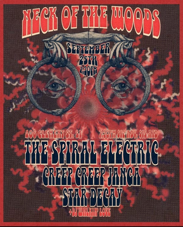 Wednesday, 9/25The Spiral Electric + Heat + Star Decay + DJ Walkin’ Love9/25 | Neck of the Woods | 406 Clement St, SF | 7:30 p.m. Doors | $12/advance, $15/doorStar Decay is a psyche rock band from West Oakland that’s known for their echo, reverb, and fuzzed out bass.