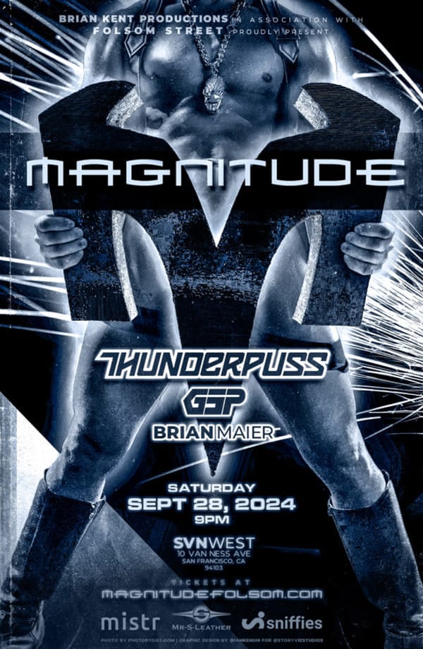 MAGNITUDE 2024- The Saturday Night Main Event of Folsom Street Fair9/28 | SVN West | 10 Van Ness Ave, SF | 9 p.m. | $99-$145Folsom Street and Brian Kent Productions are thrilled to announce the return of the filthiest dance event of the year, Magnitude Folsom 2024, for the leather and fetish community! The party features spectacular visuals as well as live performances by the most perverse adult entertainers in the business. Magnitude, the Official Saturday Night Dance Event of Folsom Street Fair, welcomes THREE LEGENDARY DJs that will no doubt bring you to your knees, making it an unforgettable part of the Folsom Street Fair experience.