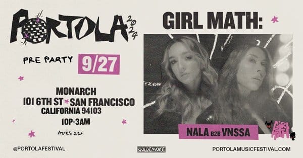 Girl Math: Nala B2B VNSSA9/27 | Monarch | 101 Sixth St, SF | $30, 21+Nala and VNSSA have joined forces to become the punchy house music duo known as Girl Math.