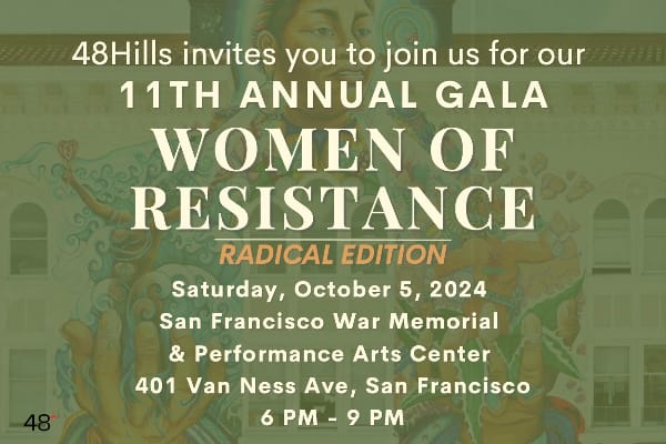 48 Hills Gala10/5 | San Francisco War Memorial Green Room | 401 Van Ness Ave, SF | 6 p.m. | $140Party time! Celebrate 11 years of independent, community-supported media with 48 Hills, and some of the most amazing women in the Bay Area. On Saturday, October 5, we’ll be lighting up the War Memorial Green Room with complementary food and drinks, live entertainment, special guest speakers, tons of local love. Get your tickets here.