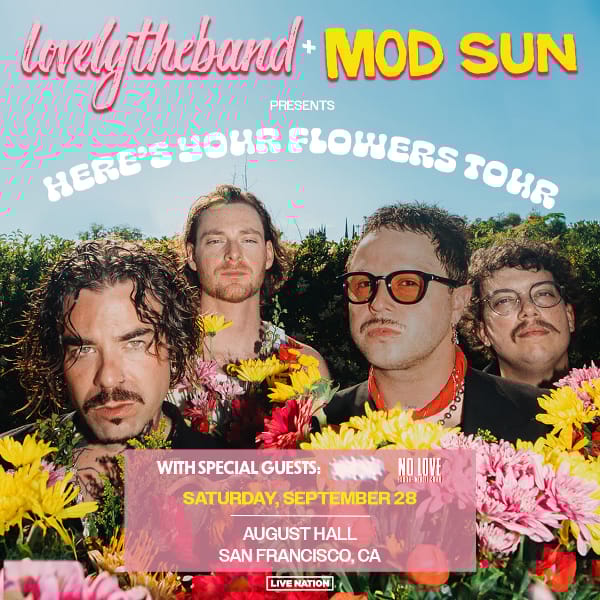 lovelytheband + Mod Sun9/28 | August Hall | 420 Mason St, SF | 6:30 p.m. | $39.23-$127.08Alternative rock band, lovelytheband is joined by American singer, songwriter, hippie rapper and musician from Minnesota, Mod Sun (one of my, me Vanessa, faves!)