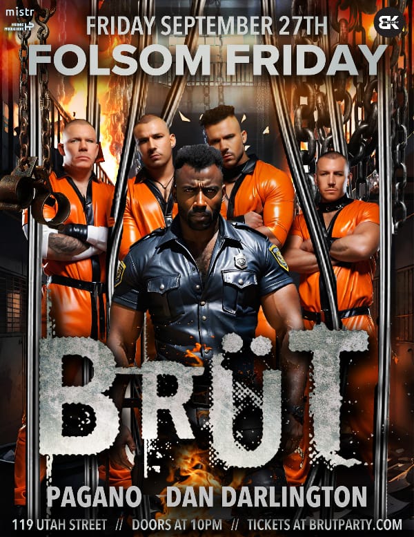 BRÜT SF – Folsom 20249/27 | The Great Northern | 119 Utah St, SF | 10 p.m. | $50-$1250, 21+Toss aside all your preconceptions about parties because BRÜT JAILBREAK is smashing through the prison walls, where the convict code is the law and the party never locks downs. With chapped cops keeping watch, frisky felons pumping in the yard, and the prison punk teaching you to “drop the soap,” we’re setting a new paradigm for LGBTQ+ events in San Francisco.