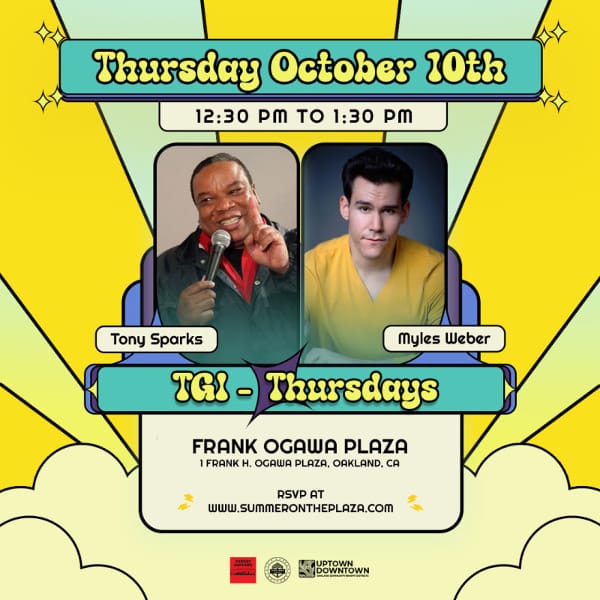 TGI-Thursdays: Comedy on the Plaza featuring Tony Sparks & Myles Weber10/10 | Frank H. Ogawa Plaza | 1 Frank H. Ogawa Plaza, Oakland | 12:30 p.m. | Free