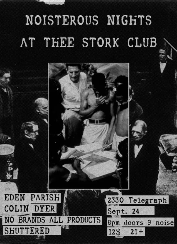 Eden Parish, COlin Dyer, NO BRANDS ALL PRODUCTS, SHUTTERED9/24 | Thee Stork Club | 2330 Telegraph Ave, Oakland | 8 p.m | $12, 21+Eden parish is an intense death industrial band. Crafting immersive soundscapes, Eden Parish combines heavy distorted textures with experimental elements that are sure to create a compelling auditory experience.