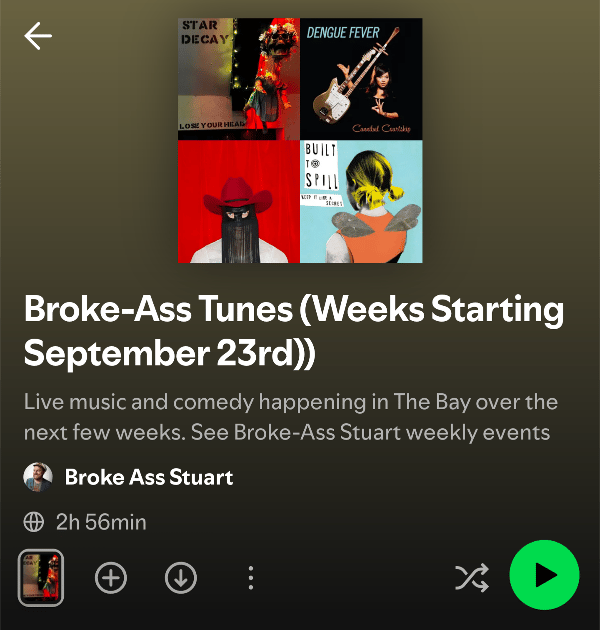 Listen to this week’s playlist so you can sample upcoming bands and comedians listed in this newsletter.