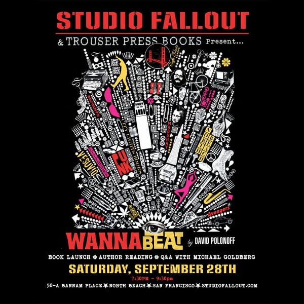 Saturday, 9/28“WANNABEAT” Book Release Party9/28 | Studio Fallout | 50-A Bannam Place, SF | 7:30 p.m. | Free, All agesTrouser Press Books and Ira Robbins will host the San Francisco release party for David Polonoff and his debut novel, WANNABEAT, at Studio Fallout. This free event will feature a Q&A with Polonoff by author and photographer Michael Goldberg along with a group of legendary musicians, artists and writers who represent the storied history of San Francisco’s beat generation and the City’s deep connection to its counterculture past.