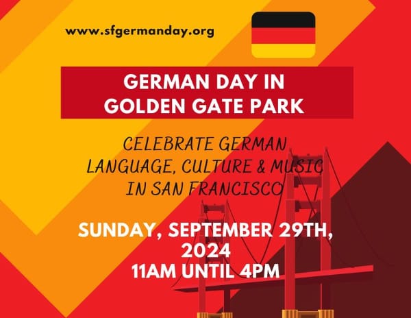 German Day in Golden Gate Park 20249/29 | Golden Gate Park Bandshell | 75 Hagiwara Tea Garden Dr, SF | 11 a.m. | FreeThe various German organizations and performers will showcase their talents and entertain the audience from the stage and each organization will also sponsor an informational table. There will be activities for children and adults, food available for purchase, and beer and wine available for purchase in an enclosed “Biergarten”.
