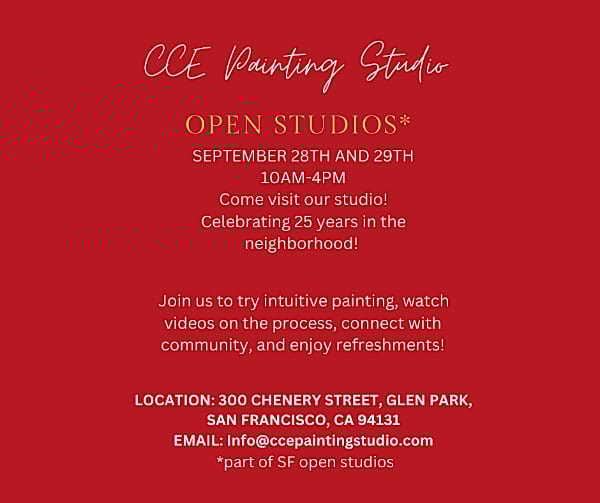 Free Open Studios: CCE Painting Studio9/28 | The Center for Creative Exploration | 300 Chenery St, SF | 10 a.m. | FreeCome visit our studio – Celebrating 25 years in the neighborhood! Join us to try intuitive painting, learn about the process, connect with community, and enjoy refreshments!