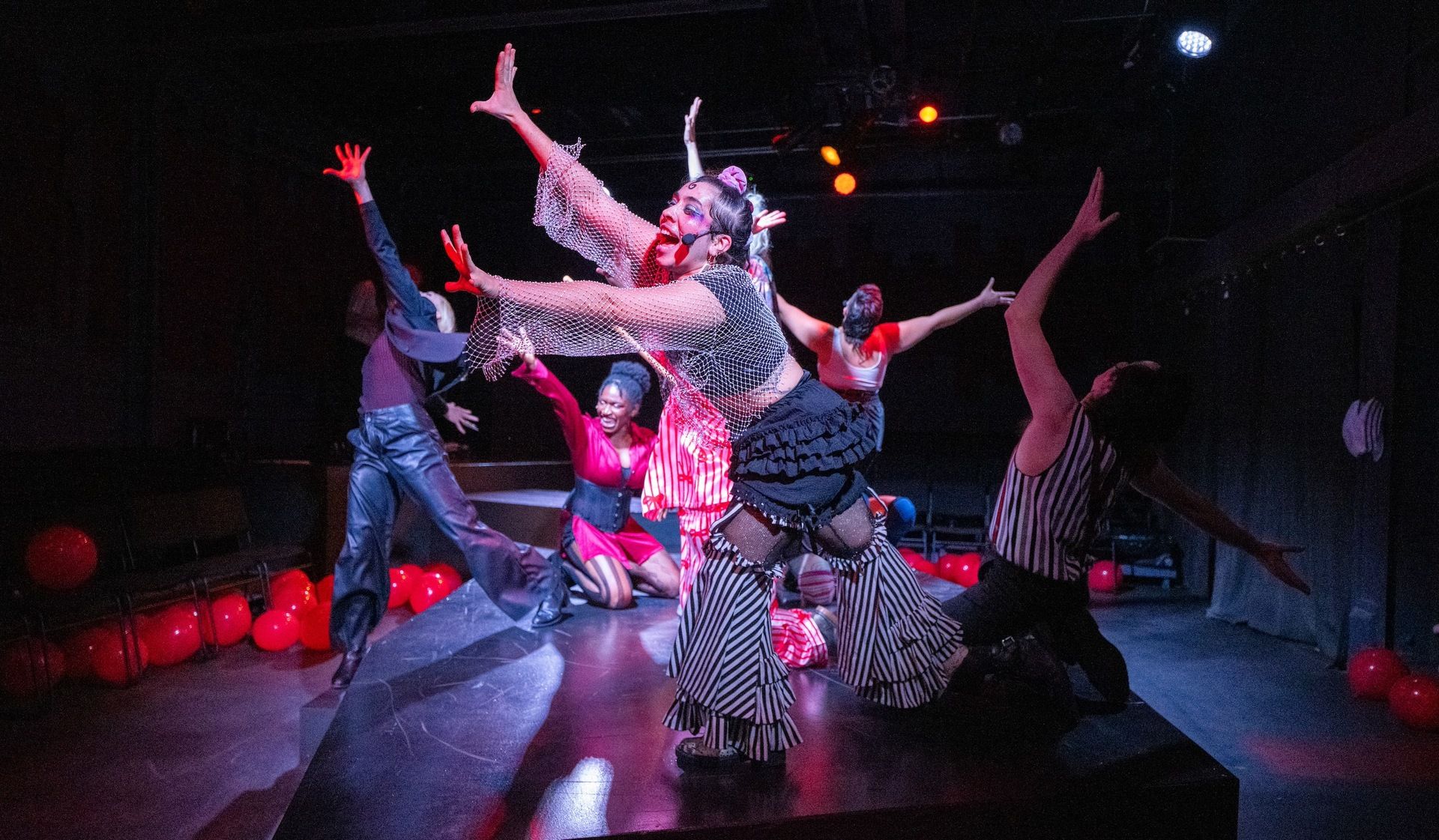Sharon Shao (center) as Sally Bowles, flanked by Deanalís Arocho Resto (top left) as the Emcee and Kit Kat Dancers Ije Success (bottom left) and Mylo Cardona (bottom right).Ben Krantz Studio