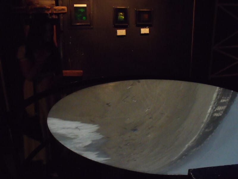Stepping inside felt surreal—as though I had entered a sanctuary of inverted perspective, where the world outside became a gentle, dreamlike reflection. The dim interior took a moment to adjust to. The hushed voices of other visitors blended softly with distant ocean sounds, creating a tranquil, almost meditative atmosphere. My eyes settled on the luminous circular screen in the center of the room, where a live, inverted image of the surrounding landscape was projected through a simple aperture in the roof onto a concave disc below. Waves rolled gently in reverse, and paragliders floated upside-down, effortlessly suspended between sky and sea.