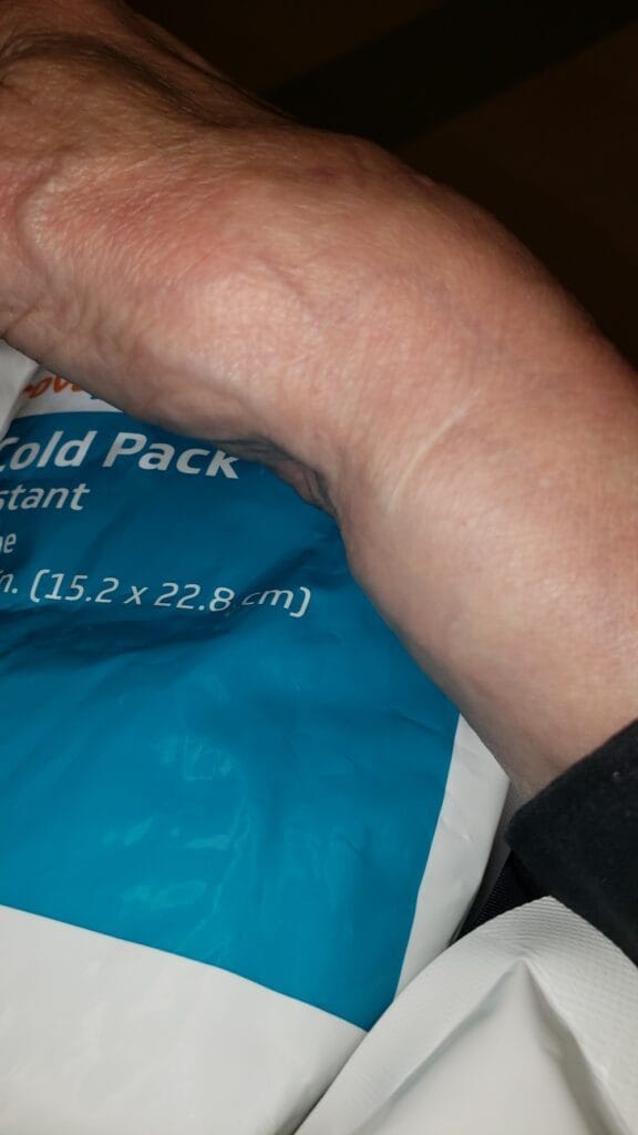“That liquid dilaudid, did the trick…finally some relief from the intense pain, the anti nausea meds, the suspension of my wrist from a tall stainless steel stand by my fore and middle fingers, with the weight of my arm itself and gravity stretching the wrist bone; 20 lbs weights added to the crook of my arm to pull the forearm more as the doctor compressed my wrist with his hand, we watched as the serrated bone was slowly put back into place. My brain picked up the signal of reattachment and the pain subsided even more – what a huge relief. Too bad the anti nausea meds didn’t work for very long – ‘Pass the barf bag, please.’