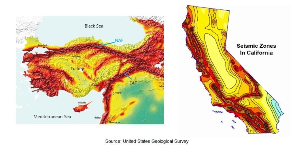 Strike-slip mechanisms dominate Turkey (North and East Anatolian Faults) as well as California’s own San Andreas. Both fault systems are capable of generating similarly devastating earthquakes.