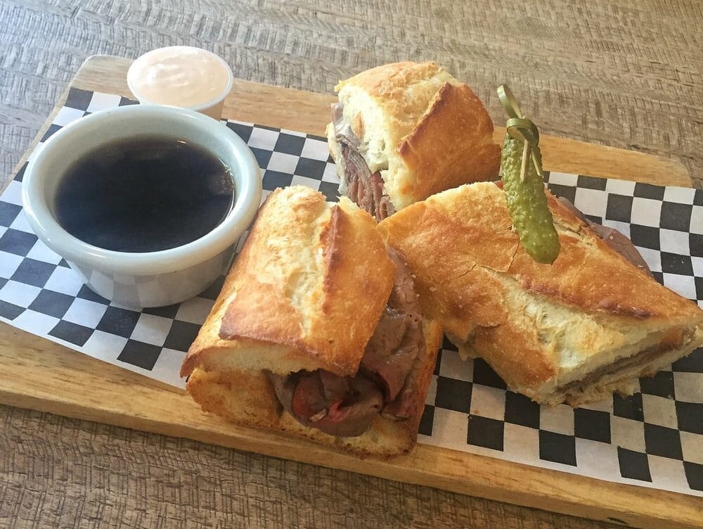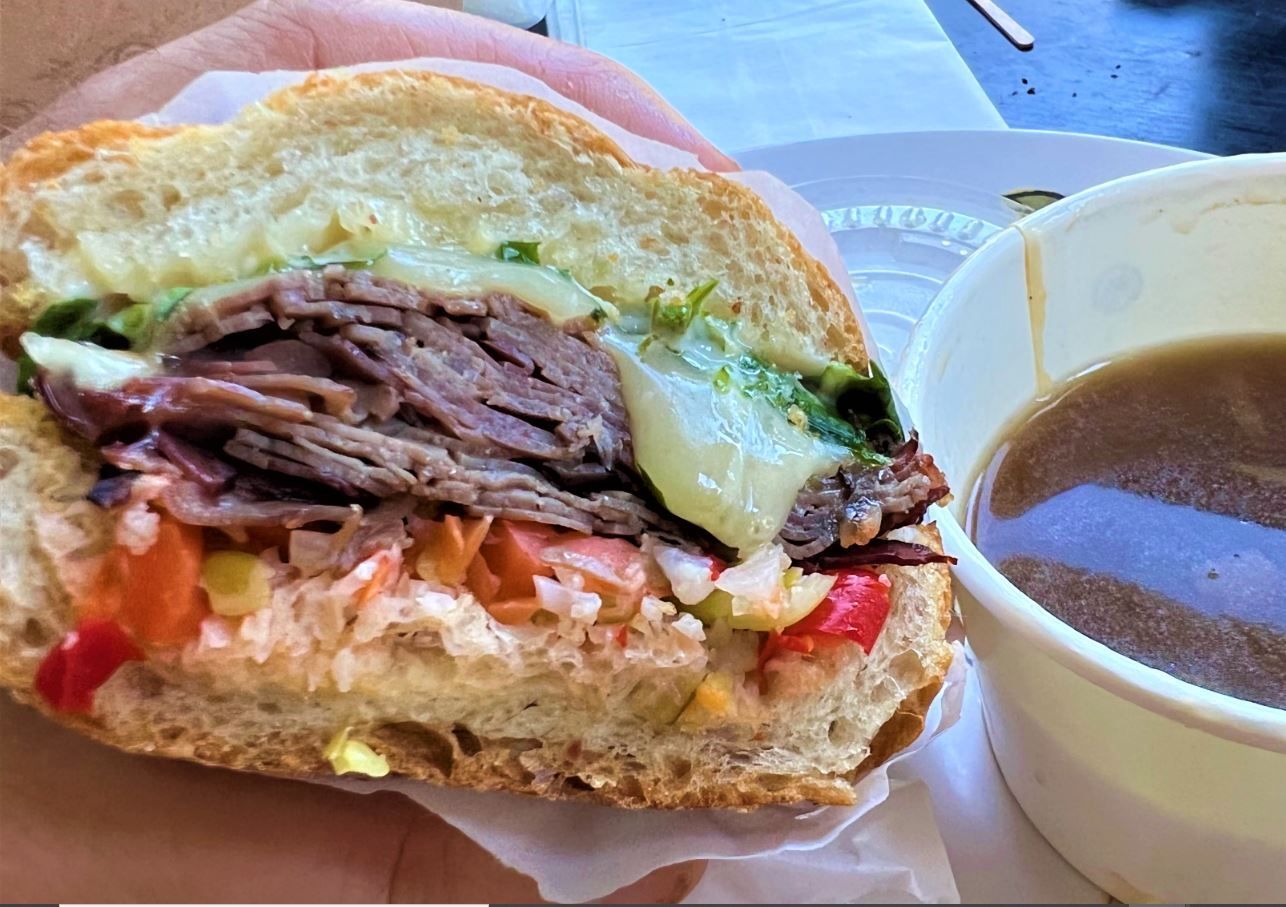 HOT ROAST BEEF, MELTED PROVOLONE, ARUGULA, ROASTED GARLIC MAYOAND GIARDINIERA ON DUTCH CRUNCH & SIDE OF CHICAGO STYLE AUS JUS